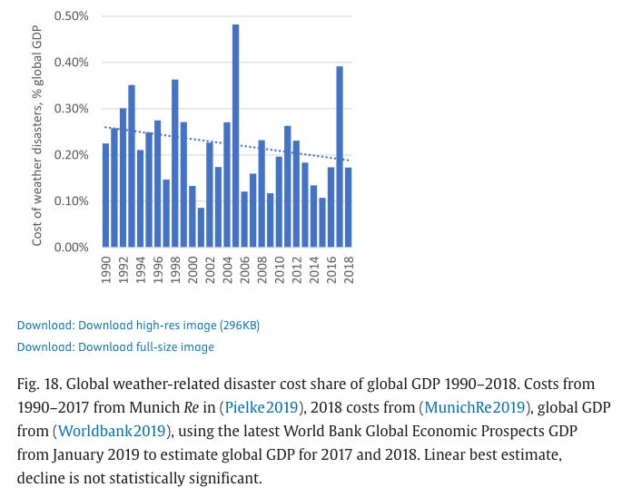 The paper lays out that hurricanes hitting the US are slightly less frequent and climate disaster costs are declining.
