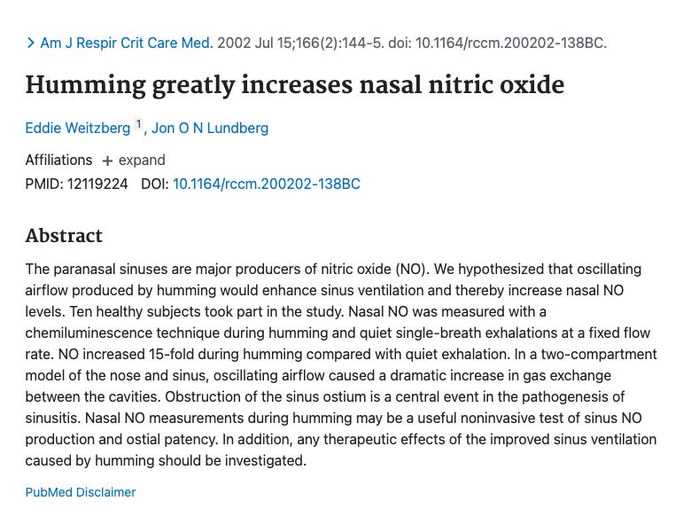 This might be because he read the 2002 paper finding that humming greatly increases nitric oxide. The paper documented that nitric oxide increased 15-fold during humming compared with quiet exhalation.
