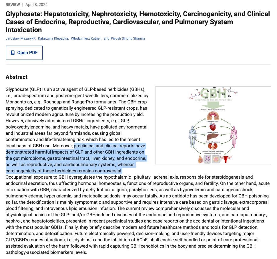 9 years ago, Canadian scientist Patrick Moore famously said that “you can drink a whole quart of [glyphosate] and it won’t hurt you.” When the interviewer he was speaking to said that they had some for him to drink, he said “I’d be happy to actually- Not, not really, but I know it wouldn’t hurt me.” When reiterating that they really do have some for him to drink he said “No, no, I’m not stupid.” He then followed that up by saying that people try to commit suicide with it and fail - “fail regularly.” The interviewer pressed again, asking if he was ready to drink a glass of it. Moore said “No. I’m not an idiot.”
